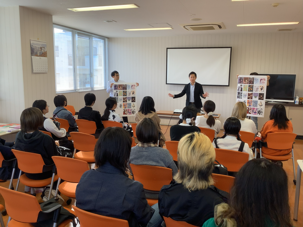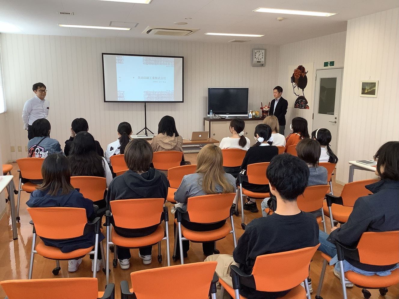 学生が工場見学にこられる3週間前に、社長の江戸と、嵯峨美術大学卒業生の社員が『印刷』を学習してもらうための出張授業をしてきました。