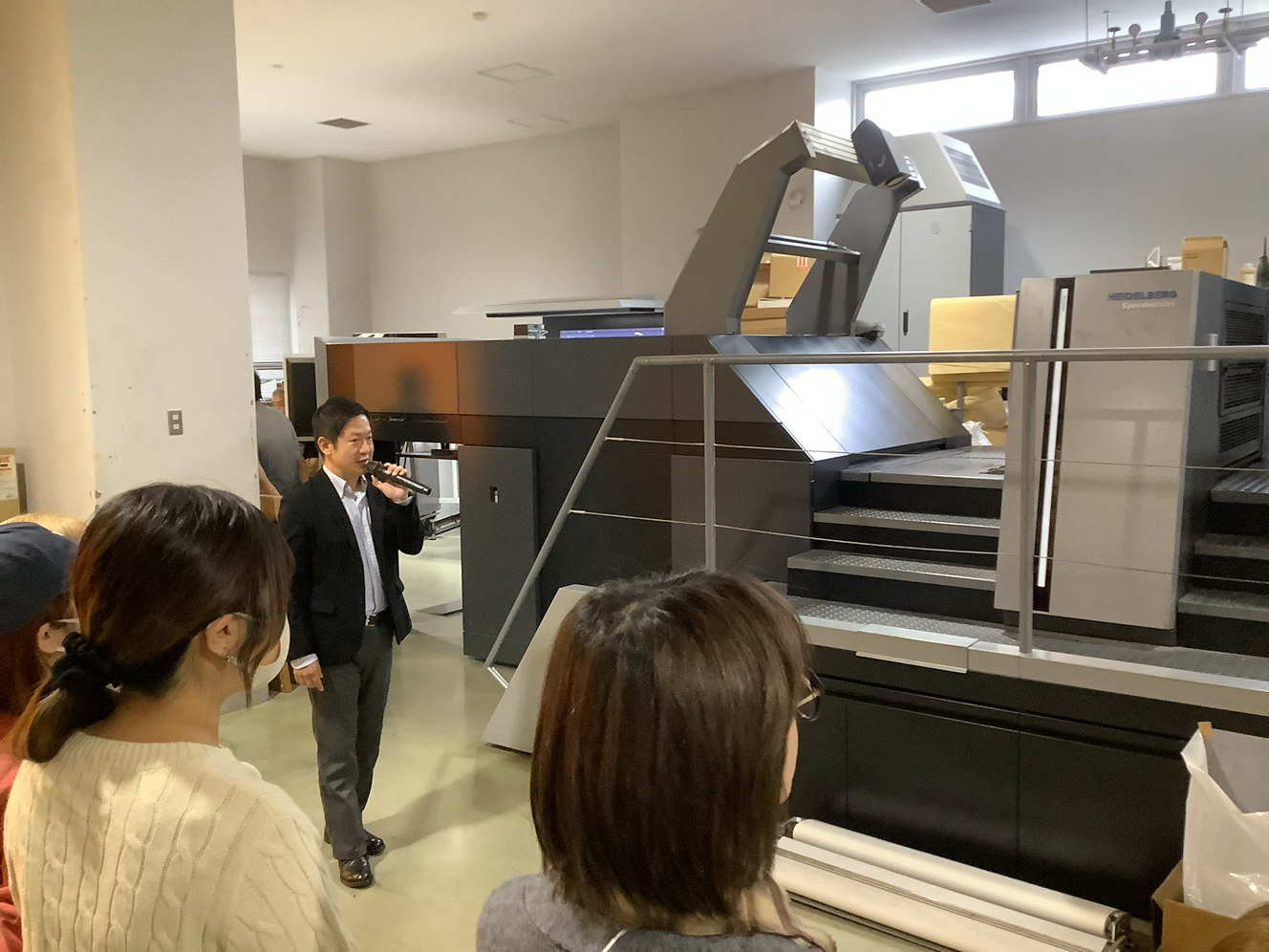 印刷工場では、大型印刷機「コモリ機」や「ハイデルベルグ機(XL106-4P)」を間近で見学していただき、実際の大きな紙に印刷する様子をご覧いただきました。